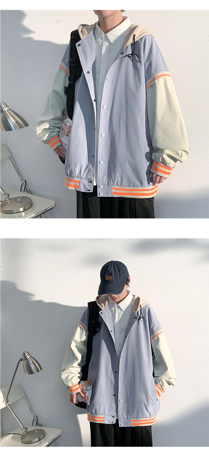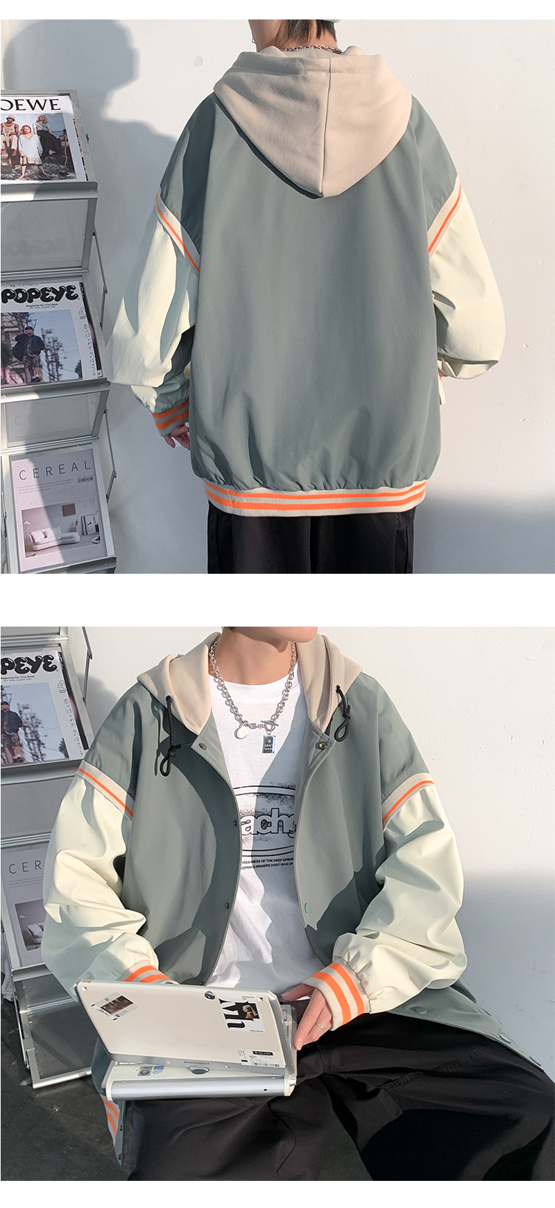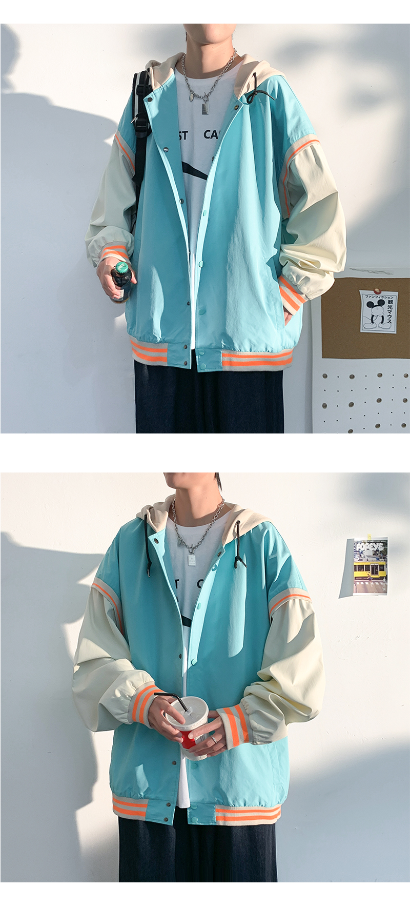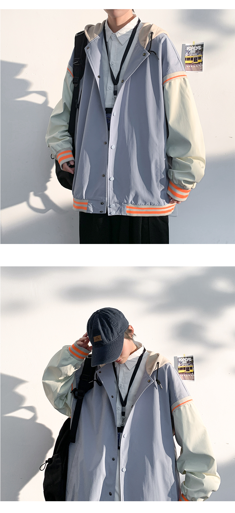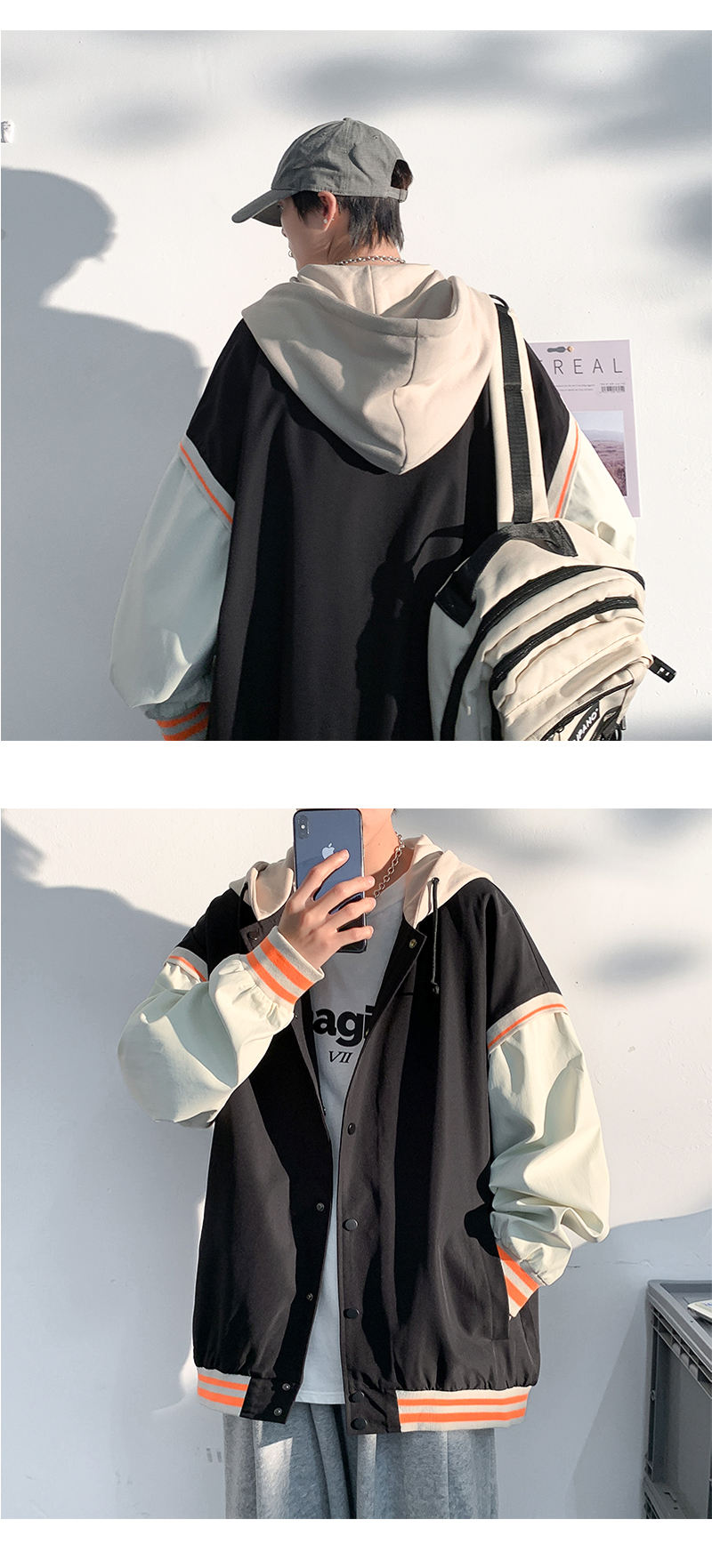 vintage假两件外套男士ins潮连帽春秋季宽松潮牌痞帅夹克大码运动