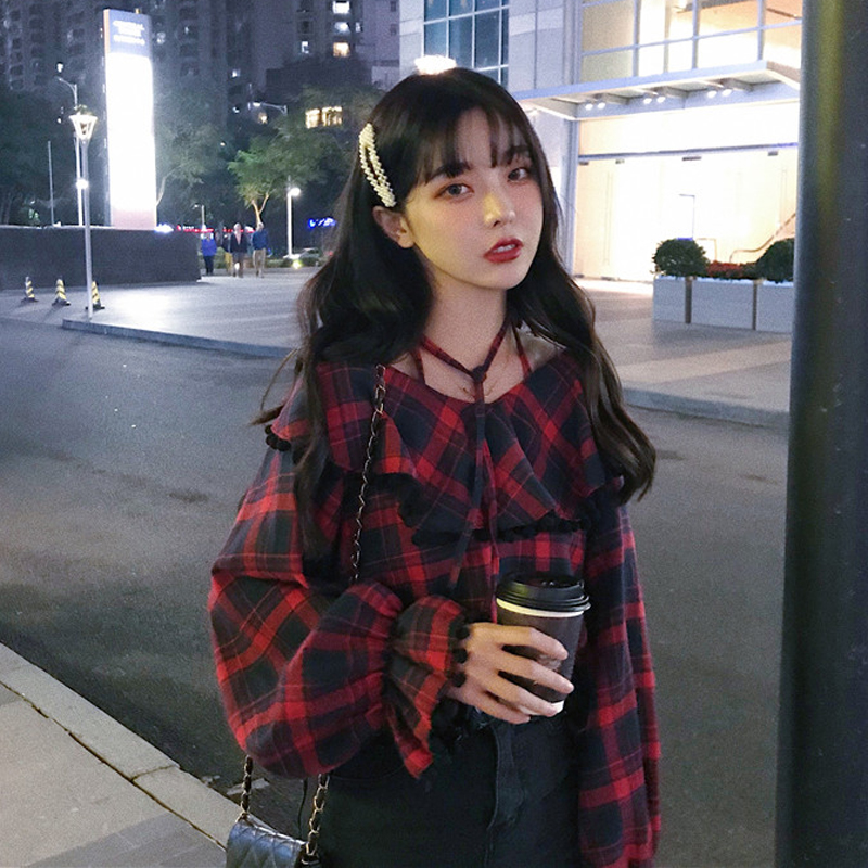 娃娃领格子衬衫女设计感小众早秋甜美可爱露肩喇叭袖一字肩上衣