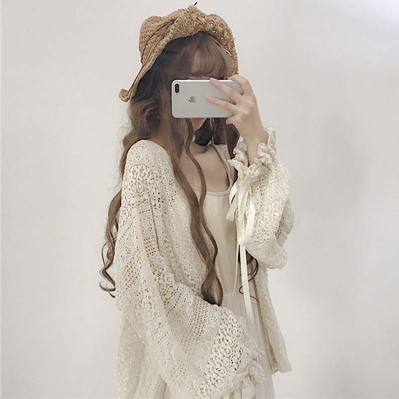 秋季中长款防晒衫外套春秋新款灯笼袖开衫上衣长袖蕾丝打底衫女