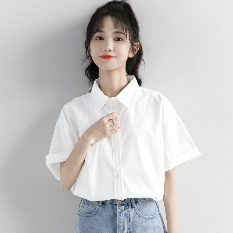 2021夏季新款白色工装短袖衬衫女夏宽松韩版纯色上衣百搭休闲衬衣