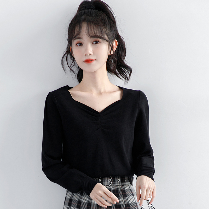 2021秋季新款法式露锁骨方领针织衫女黑色薄款毛衣春秋长袖短上衣