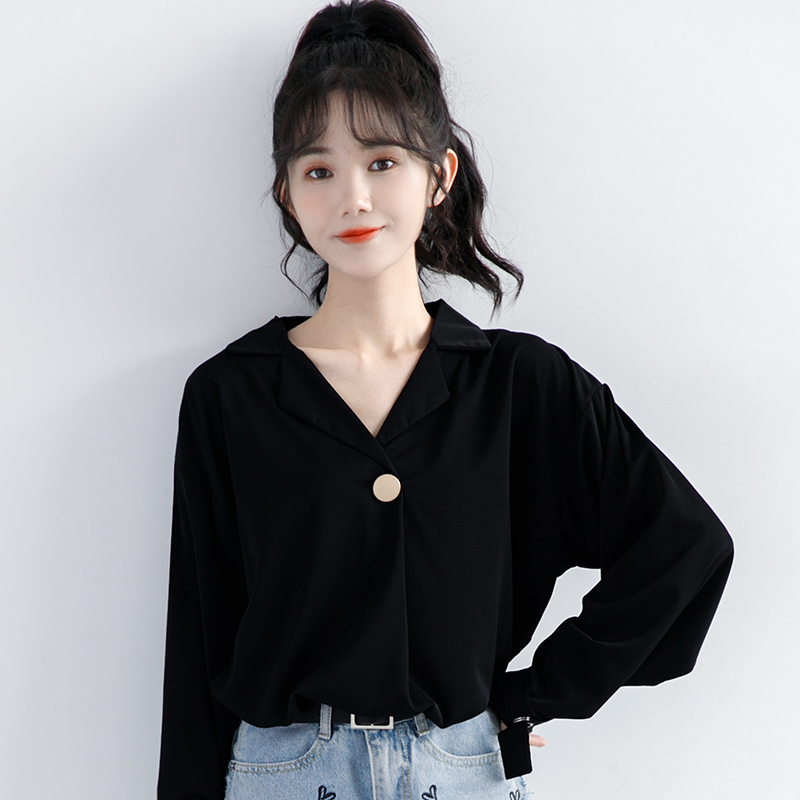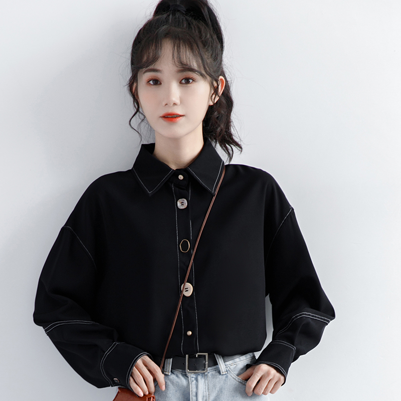2021秋季新款复古港风一粒扣黑色长袖衬衫女春秋衬衣宽松休闲上衣