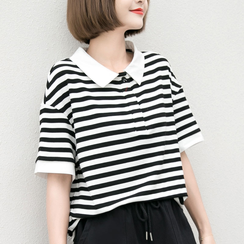 孜索2019新款复古短袖t恤女宽松韩版学生黑白条纹polo衫保罗上衣