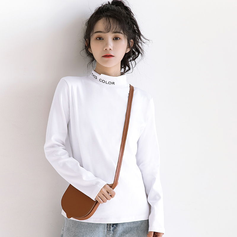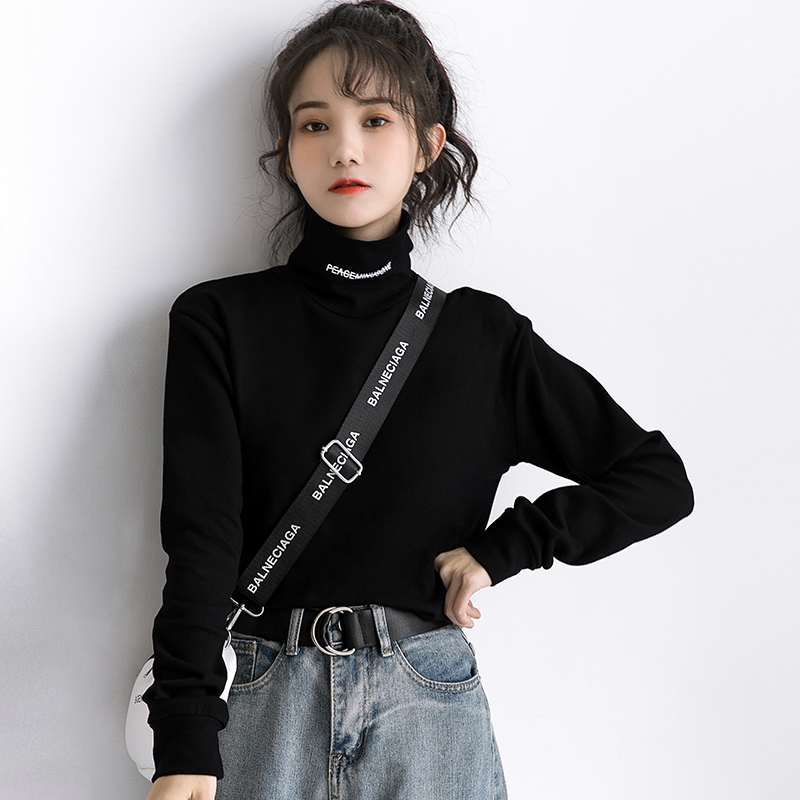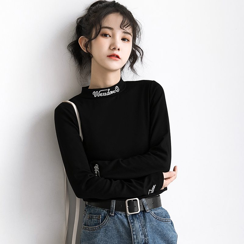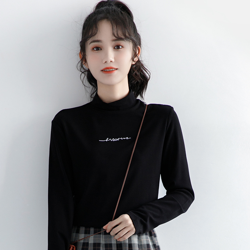孜索2021秋季新款黑色半高领刺绣字母打底衫女秋冬内搭长袖上衣潮