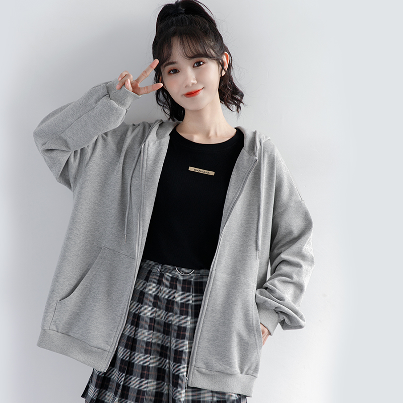 2021秋季新款复古港风灰色卫衣外套女春秋薄款连帽拉链开衫ins潮