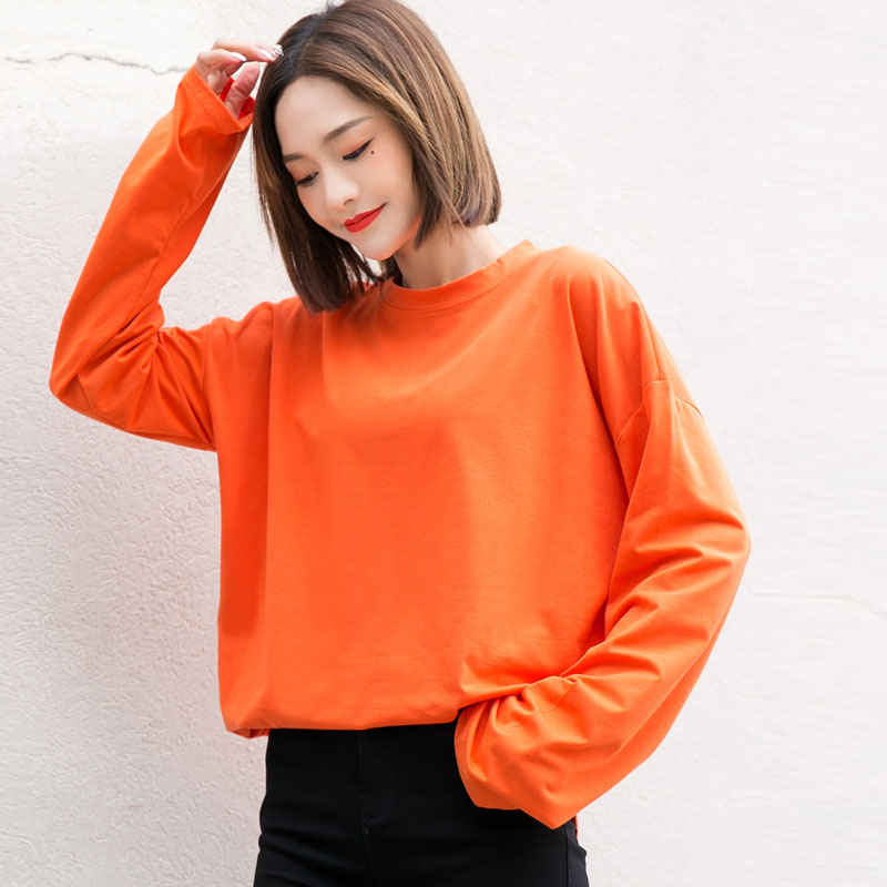 孜索2020春季新款橘色长袖T恤女宽松百搭纯色打底衫BF风内搭上衣