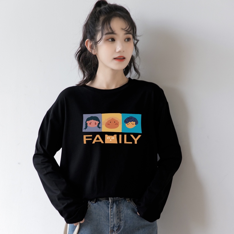 2021秋季新款港风印花黑色长袖T恤女春秋宽松休闲体恤纯棉打底衫