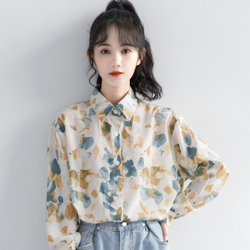2021秋季新款港风雪纺长袖花衬衫薄款女秋设计感小众衬衣宽松上衣