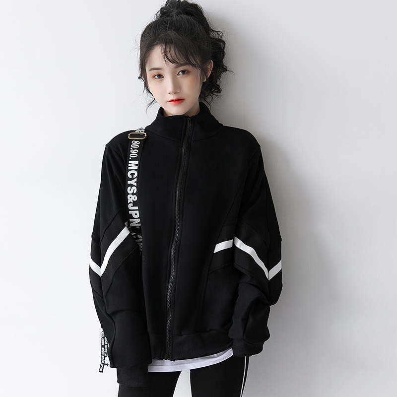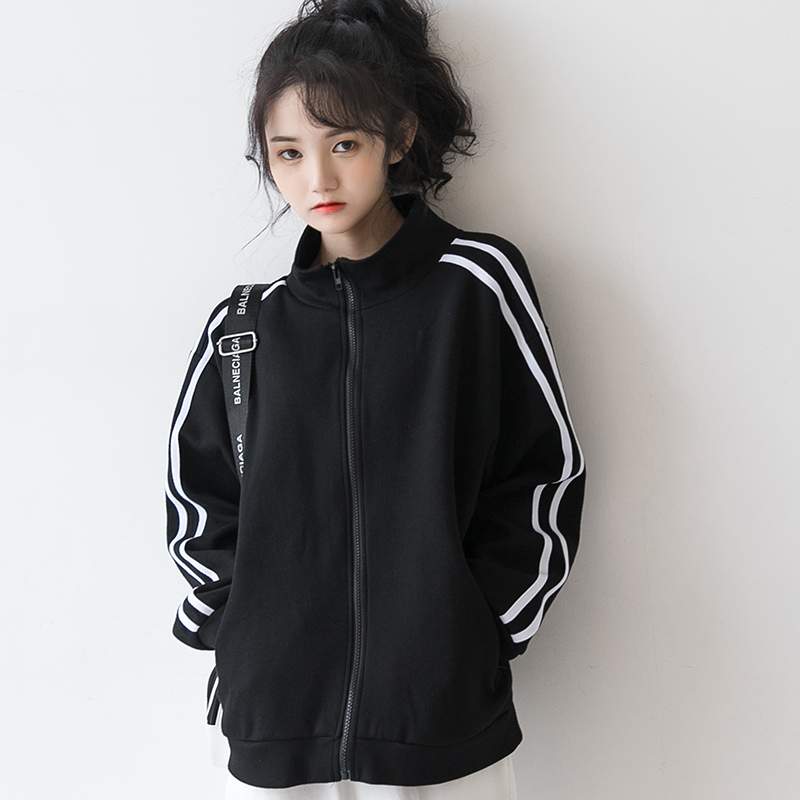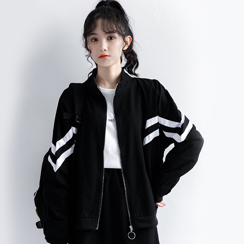 2021秋季新款港风条纹黑色外套春秋薄款拉链开衫BF风棒球服ins潮