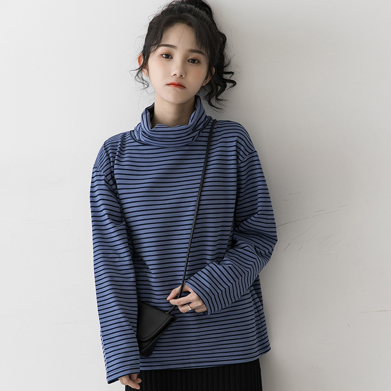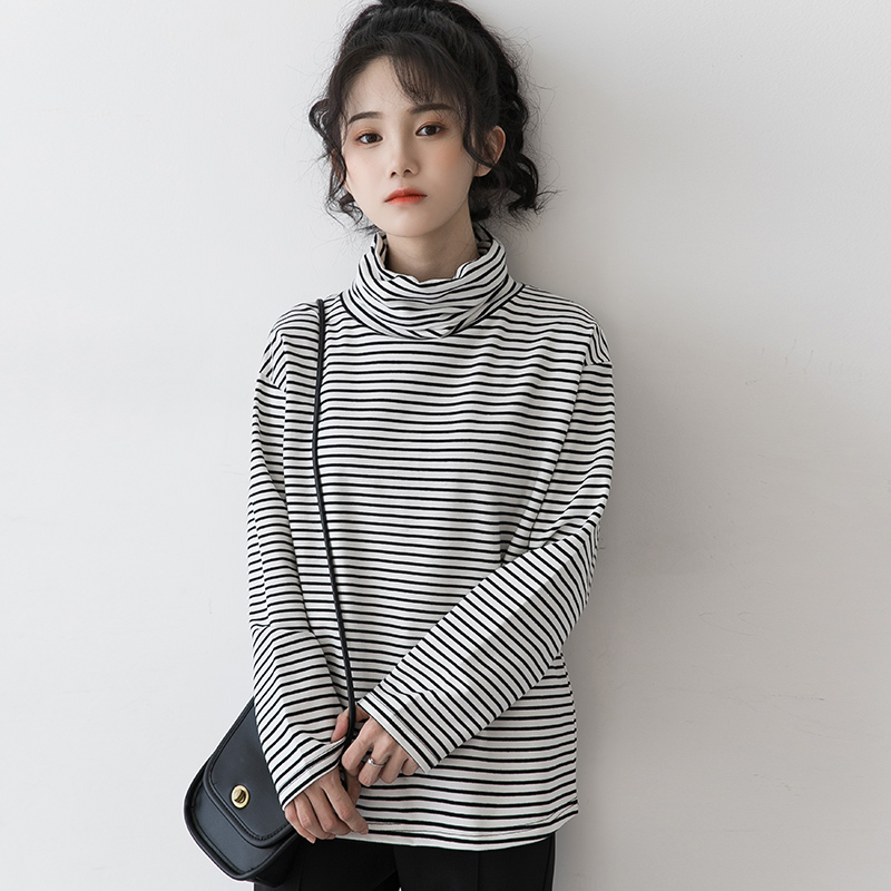孜索2021秋冬季新款条纹高领打底衫女宽松长袖T恤堆堆领学生上衣
