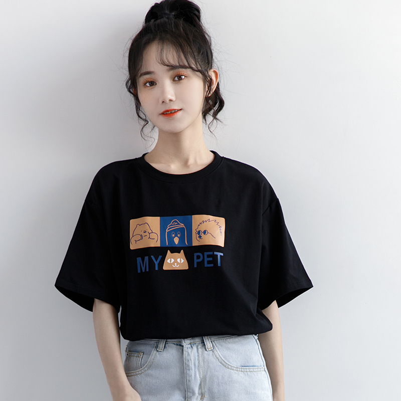2021夏季新款卡通印花黑色短袖T恤女简约百搭圆领体恤打底上衣潮