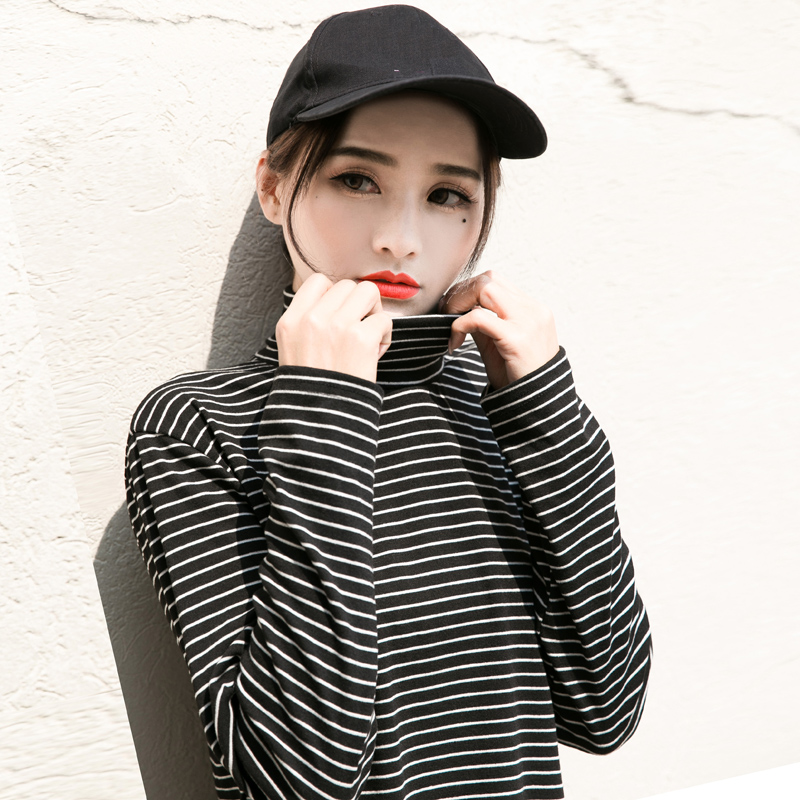 孜索2021秋冬新款高领条纹打底衫女宽松内搭学生长袖T恤黑白上衣