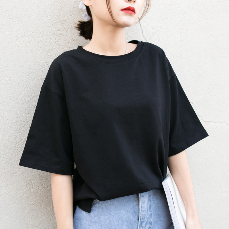 孜索2021春夏宽松纯色T恤简约韩版黑色短袖女夏圆领半袖打底体恤