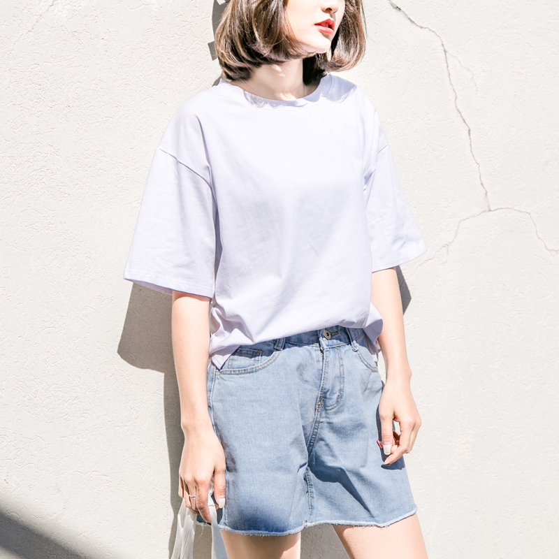 孜索2021女装白色T恤学生宽松纯色中袖上衣女夏半袖棉T纯白短袖