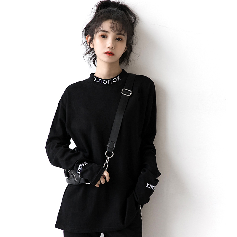 孜索2021春秋新款字母黑色半高领打底衫女宽松长袖T恤港风上衣潮
