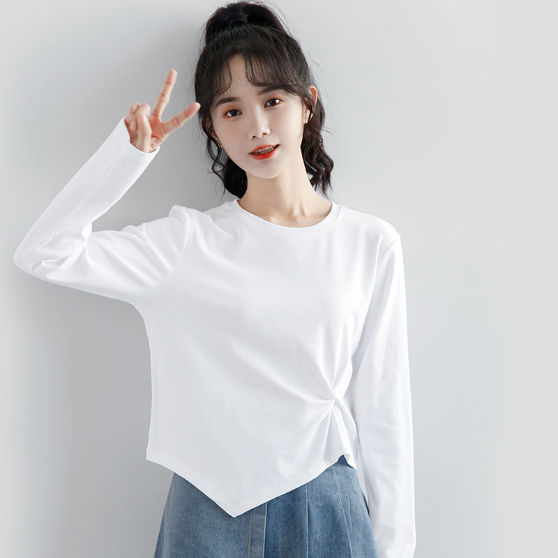 2021秋季新款不规则设计感白色长袖T恤女春秋短款上衣纯色打底衫