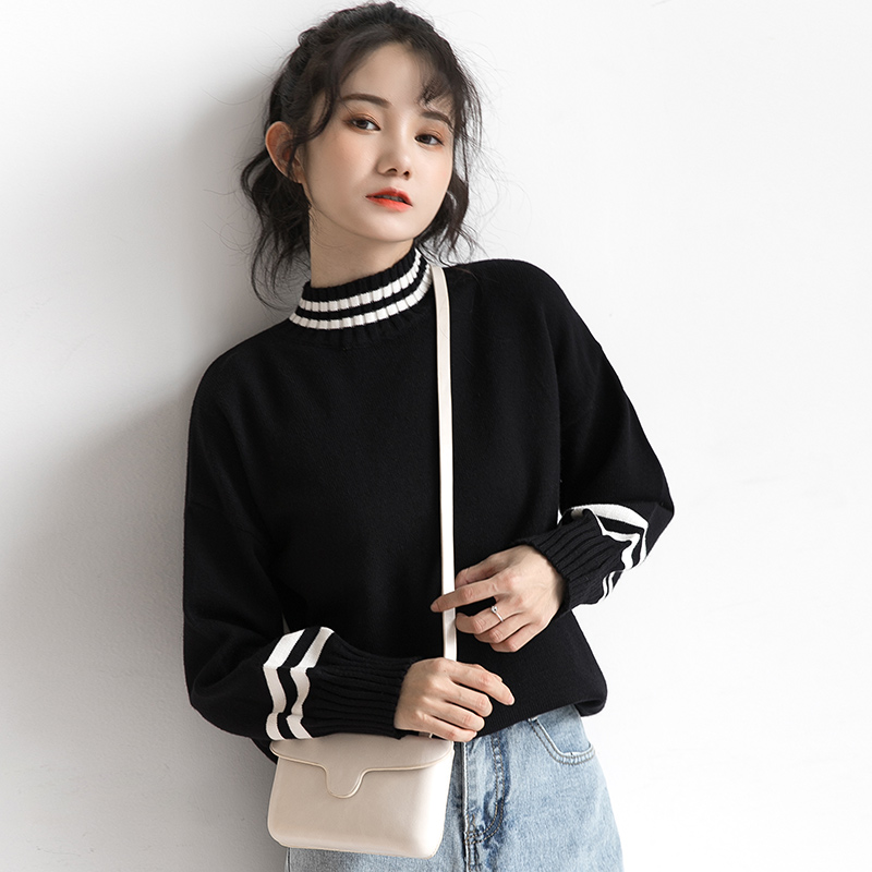 孜索2021秋季新款条纹边黑色半高领打底衫女宽松套头长袖针织衫潮