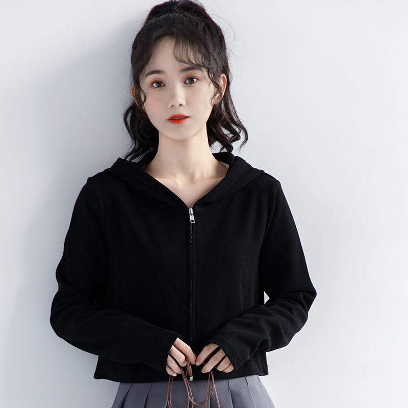 2021秋季新款连帽黑色卫衣外套女春秋短款拉链开衫简约百搭上衣潮