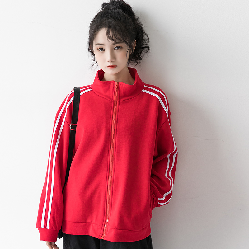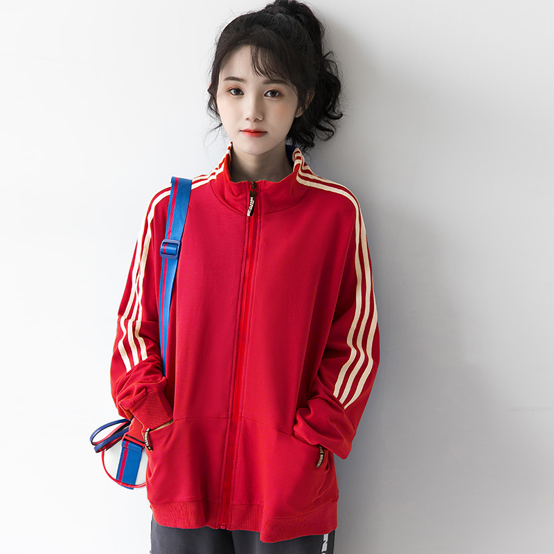 孜索2021秋季新款红色外套女宽松运动棒球服春秋韩版三条杠开衫潮