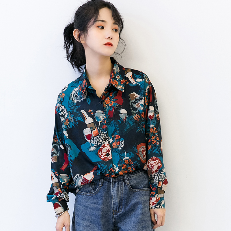 孜索2021秋季新款印花衬衫女复古港味长袖宽松韩版百搭雪纺衬衣潮