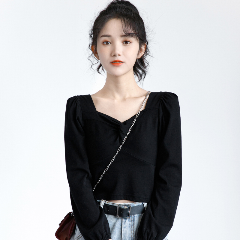 2021秋季新款法式泡泡袖短款方领上衣黑色春秋高腰露脐长袖T恤女