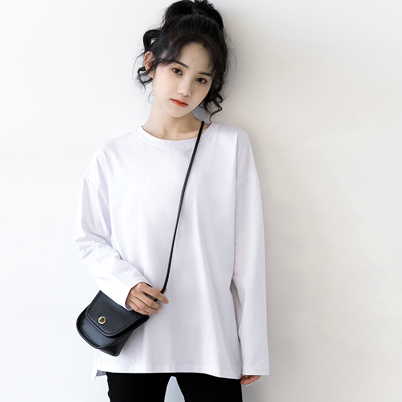 孜索2021新款长袖白色T恤女春秋韩版宽松简约学生百搭纯白打底衫