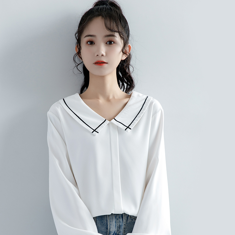 2021秋季新款学院风娃娃领长袖白色衬衫女春秋雪纺衬衣宽松上衣潮