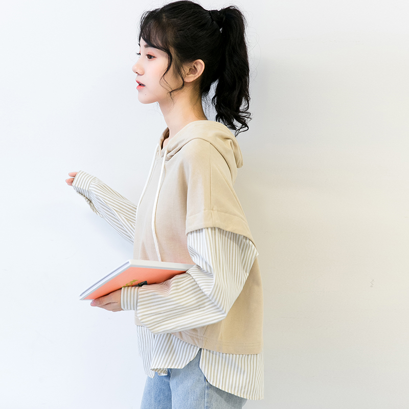 孜索2021秋季新款韩版学生假两件上衣女衬衫袖子连帽卫衣拼接春秋