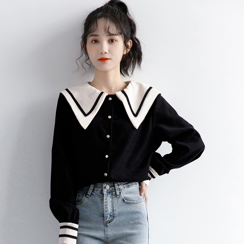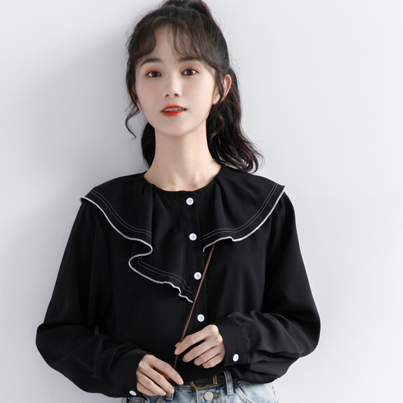 2021秋季新款日系学院磨毛黑色长袖衬衫学生娃娃领衬衣春秋上衣女