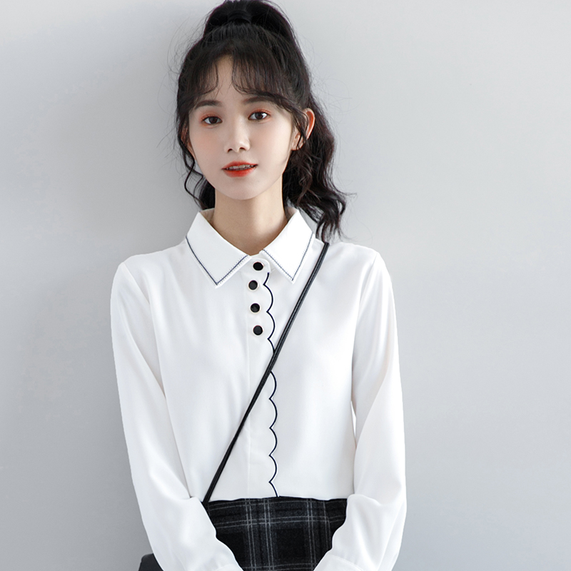 2021秋季新款波浪边小众设计感白色长袖衬衫学生Polo衬衣白上衣女