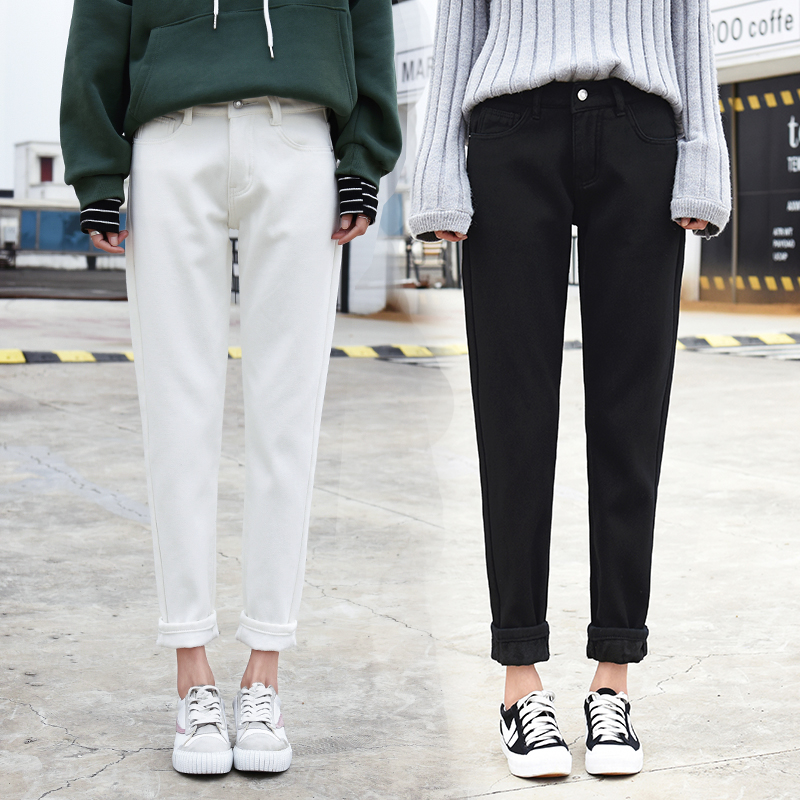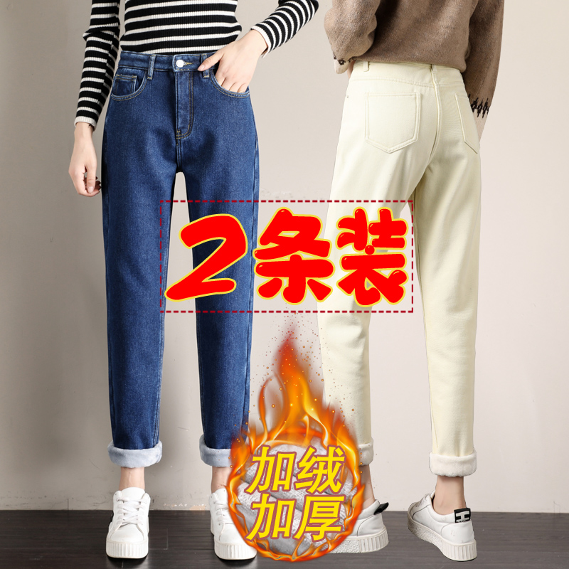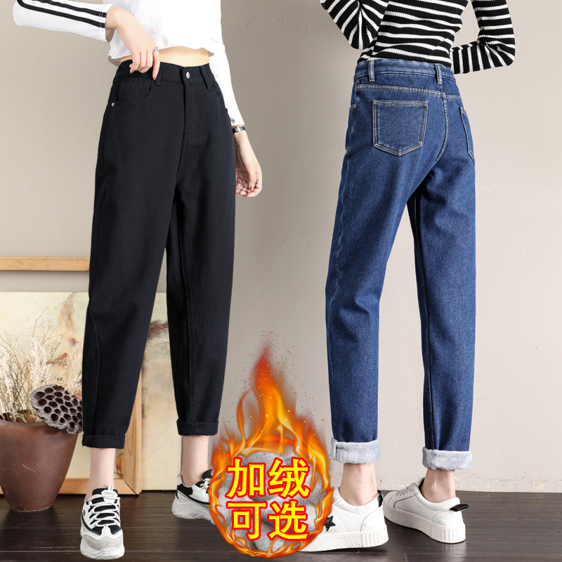 加绒牛仔裤女直筒宽松哈伦裤2021新款秋冬季高腰加厚外穿萝卜裤子