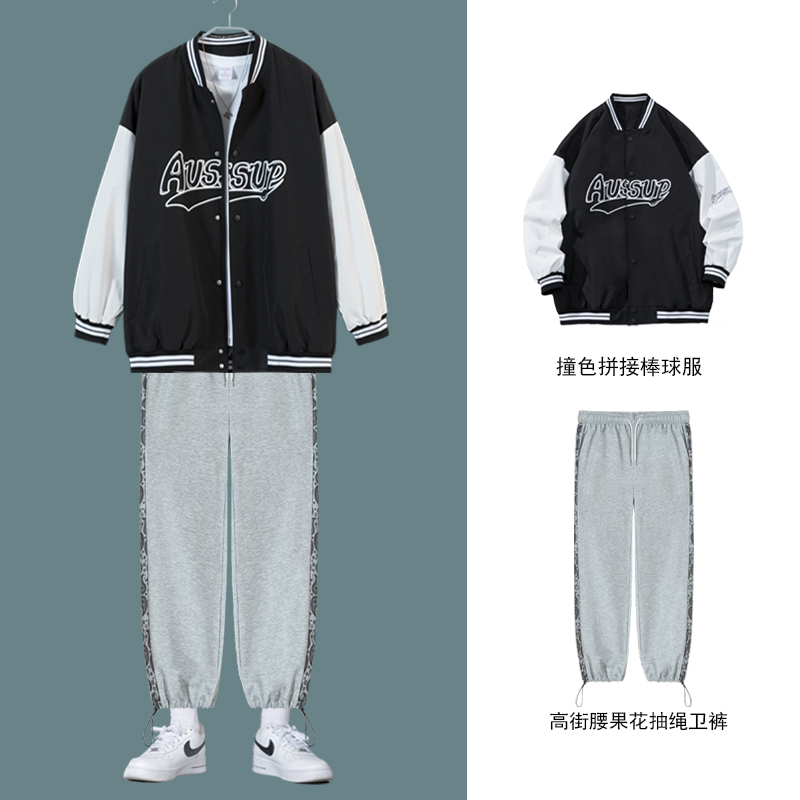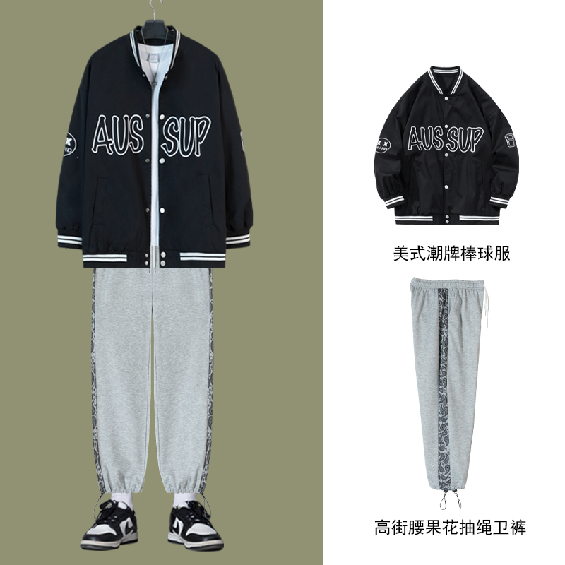 男装一套搭配休闲运动时尚套装男宽松大码春秋季男美式棒球服外套