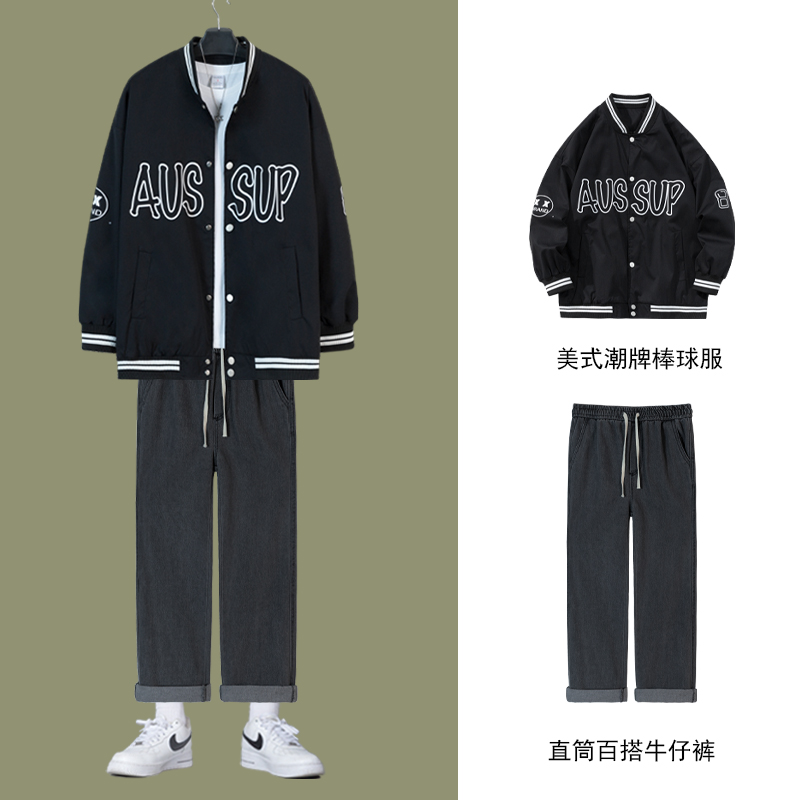 棒球服外套男生穿搭一套搭配直筒牛仔裤学生春秋款两件套装夹克帅