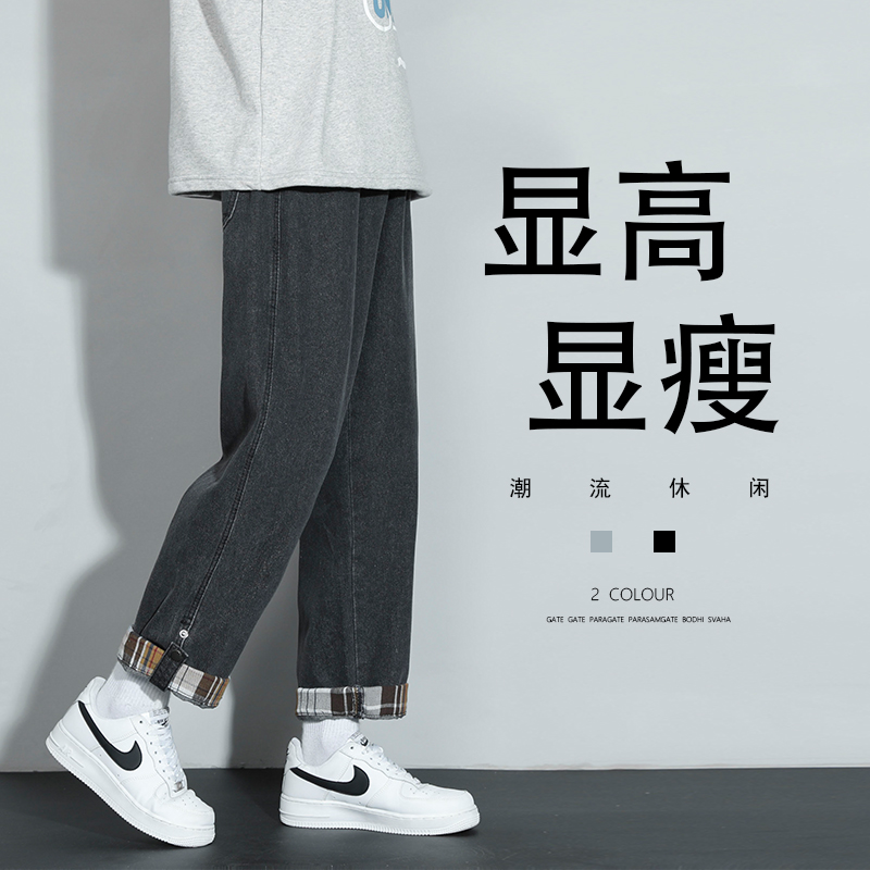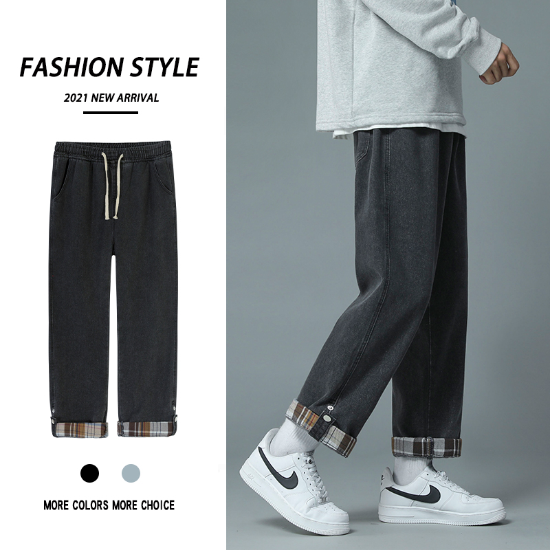 牛仔裤男春秋2021年新款宽松直筒潮流黑色大码卷边格子休闲长裤子