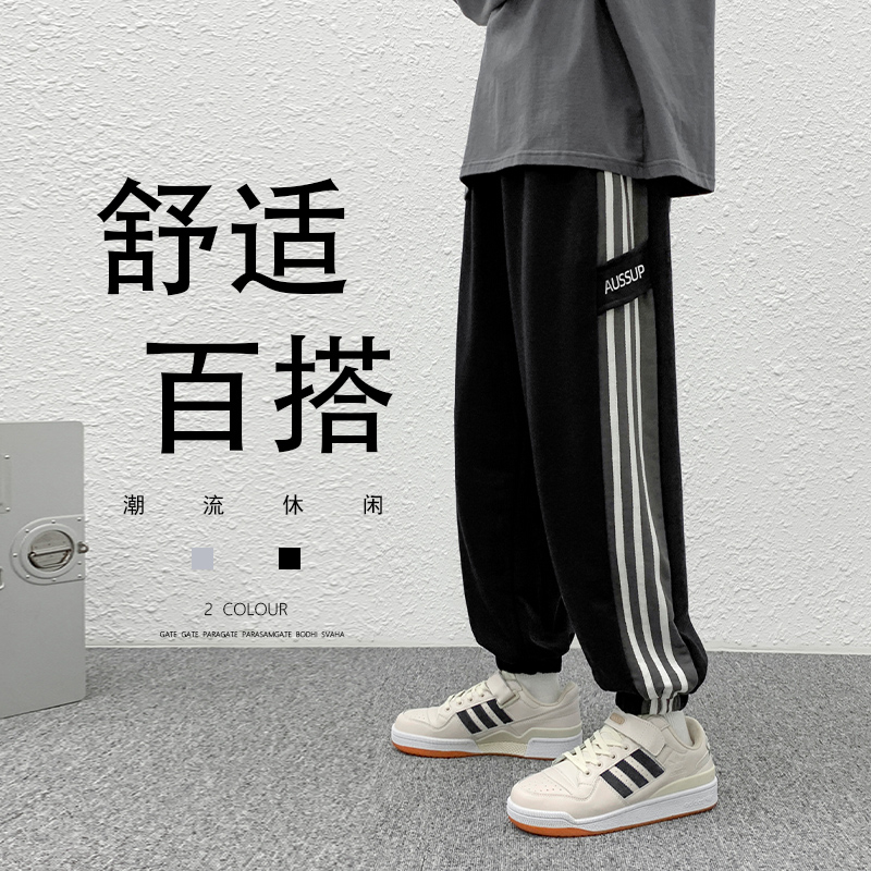 条纹运动束脚裤子男宽松潮牌春秋季大码港风学生百搭潮流卫裤高街