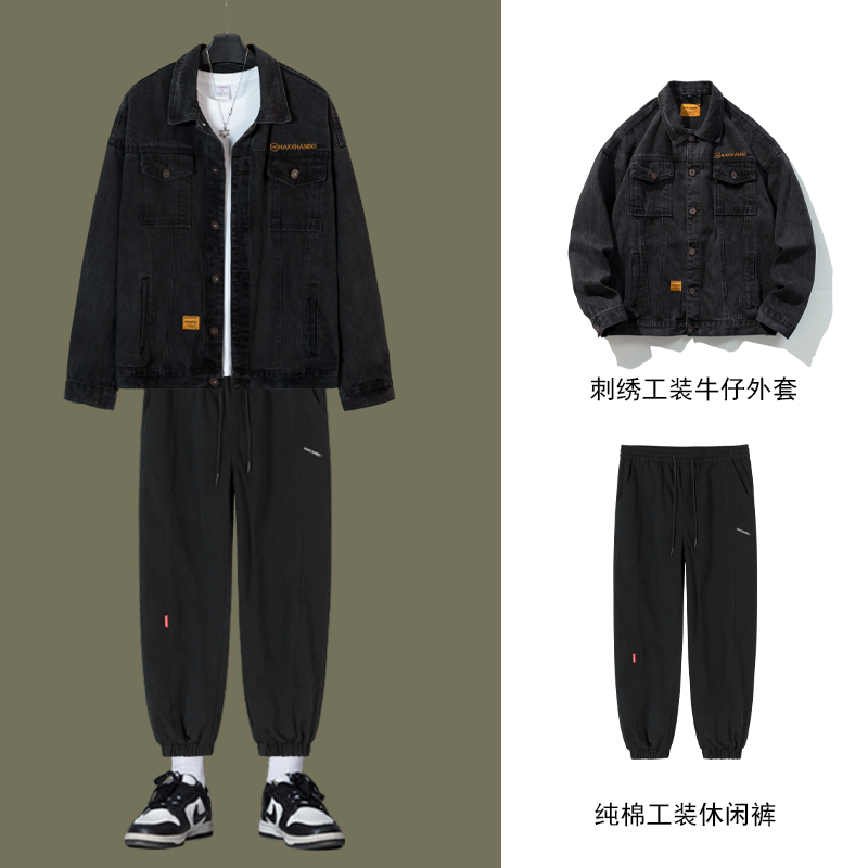 炸街痞帅日系复古潮流工装牛仔外套男装休闲时尚套装宽松显瘦一套