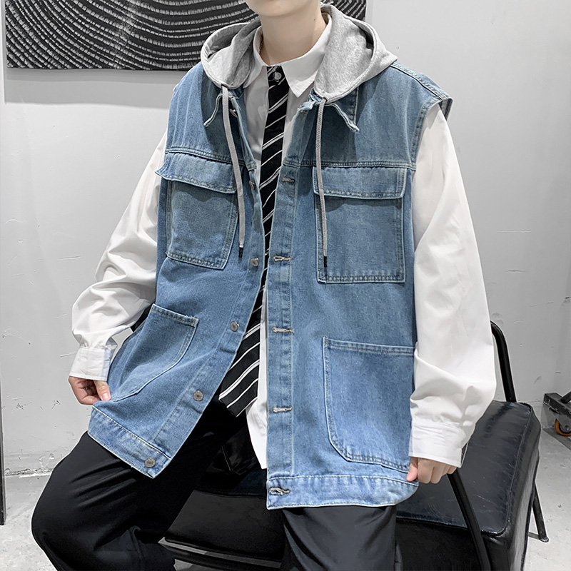 工装牛仔马甲男士秋季高街潮流ins宽松大码背心帅气连帽无袖坎肩