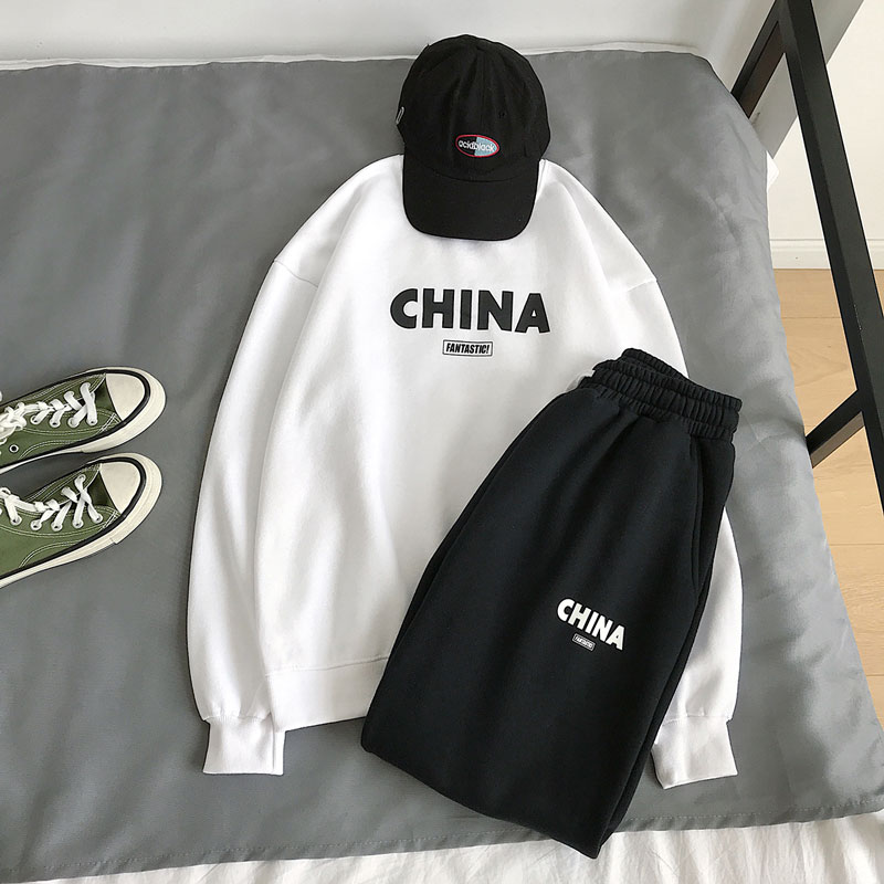 字母运动服装男士套装春秋季大码oversize潮牌卫衣卫裤胖子两件套