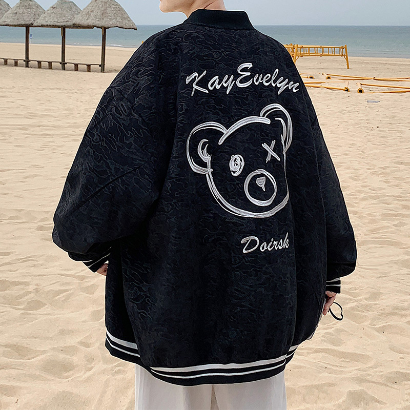 小熊涂鸦棒球服外套男士春秋季港风潮流宽松大码帅气百搭夹克上衣