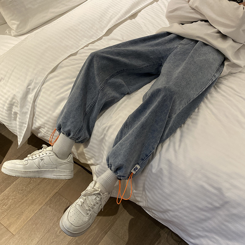 抽绳束脚九分牛仔裤男士春秋款复古潮流休闲百搭潮牌痞帅学生裤子